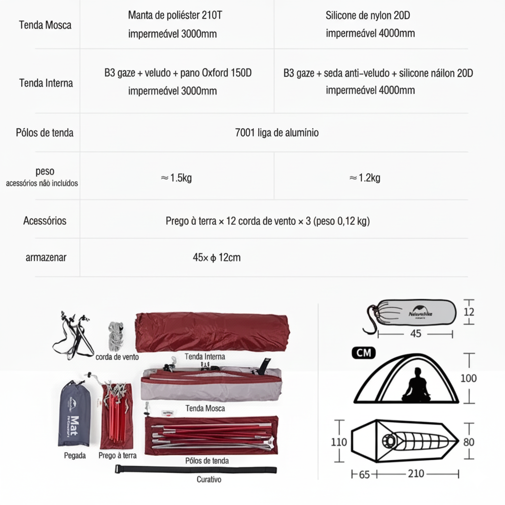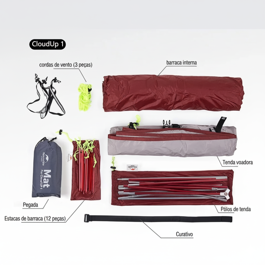 A Naturehike Cloud Up 1 Verde Militar é a companheira ideal para quem busca liberdade e praticidade nas trilhas. Pesando apenas 1,5kg, oferece conforto, segurança e montagem rápida em qualquer terreno. Seu design aerodinâmico e estrutura em alumínio 7001 garantem estabilidade mesmo sob vento forte e chuva intensa.